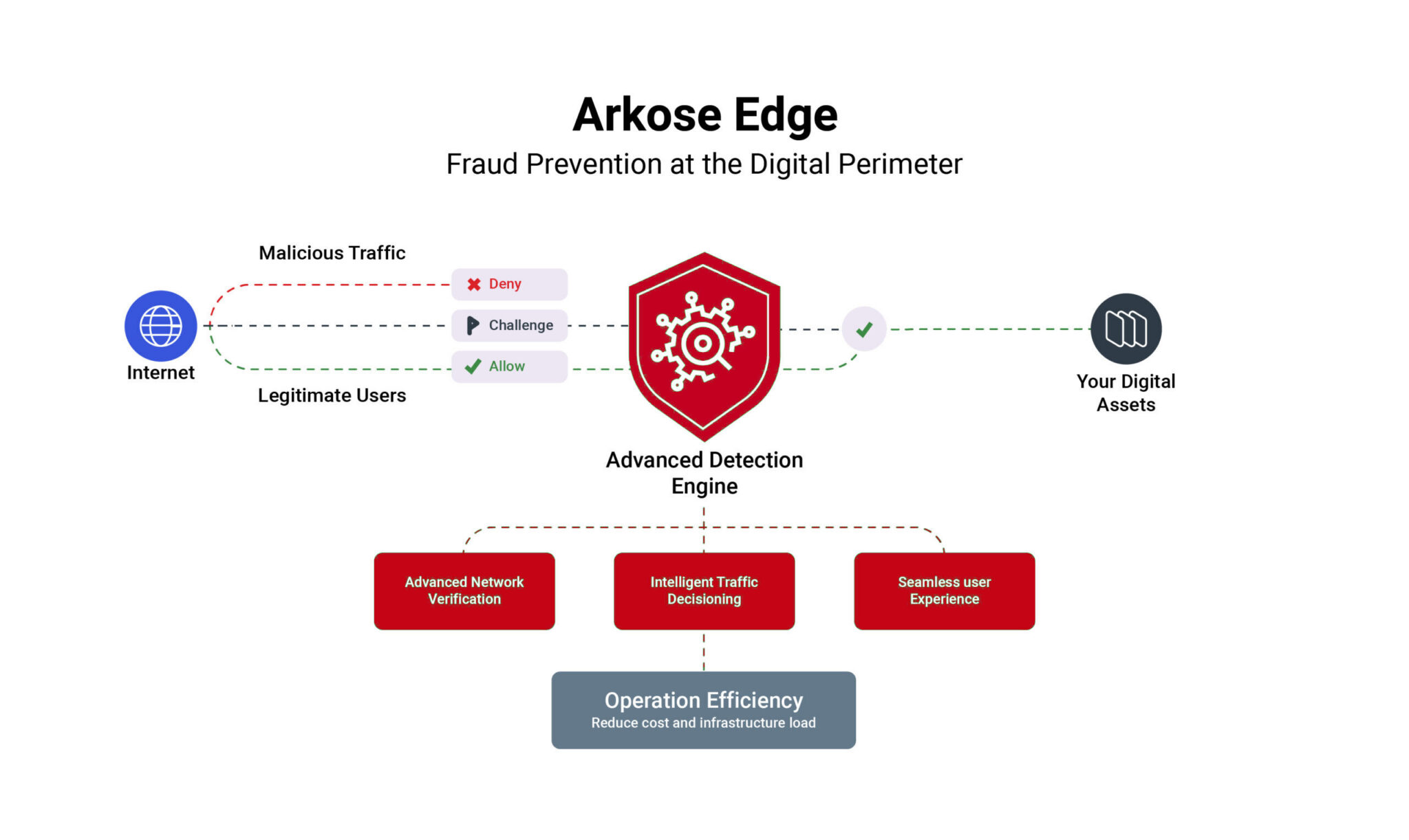 Arkose Edge delivers powerful server-side protection through a streamlined API solution that seamlessly integrates into your infrastructure with a lightweight call at any endpoint, collecting essential data signals to deliver intelligent risk assessments and actionable allow/challenge/deny recommendations based on comprehensive consortium intelligence.